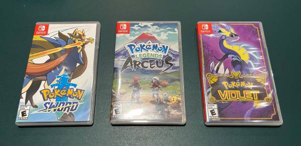 - 3 Pokemon Switch games all with box and cartridge (Pokemon Sword, Pokemon Legends Arceus, Pokemon Violet)