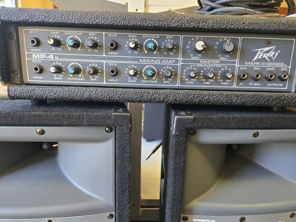 PA System Set Up with (2) TP1200 Speakers and Peavy MP-4 Power Amp Excellent condition! Works great! Everything sold as bundle! Any questions? Feel free to call/email/chat.