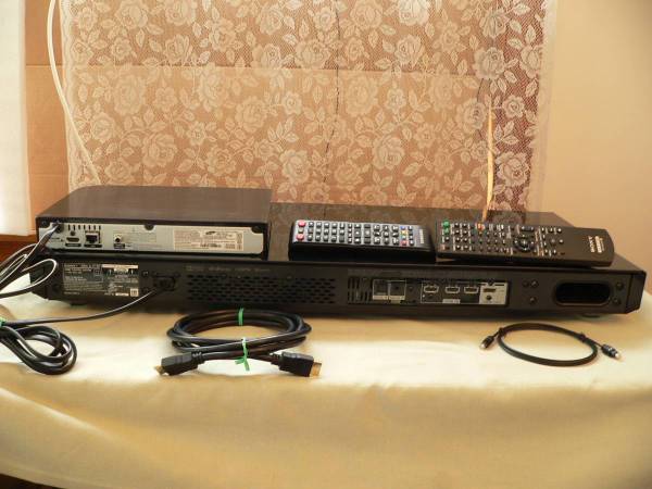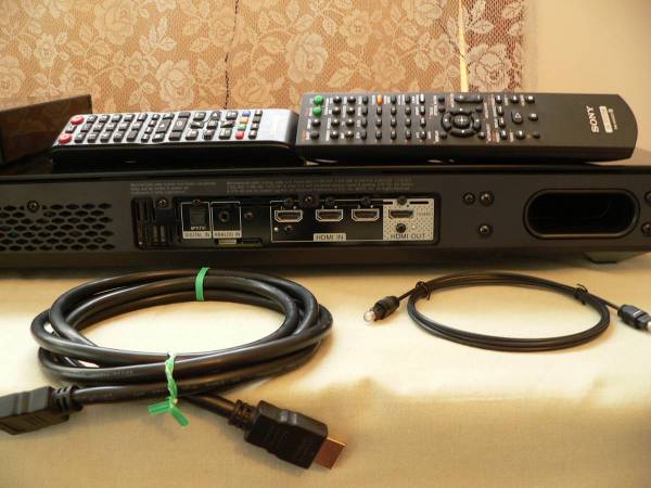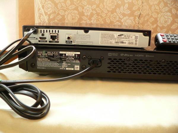 SUPER KOOL HIGH END GORGEOUS SONY 2.1 AVR SYSTEM HT-XT1 WITH REMOTE. Comes with a free Samsung with full 1080p, Blu-Ray, DVD, CD Player with remote. This Sony features Bluetooth, Dolby True HD, DTSHT, 4 HDMI's 3 in/ 1 out ARC and a optical output. Why listen to those teeny TV speakers when you can have a big movie theater/home theater listening experience in a super kool eye candy looking AVR System with low end sound you not only hear but feel? This Sony has a slick and sleek finish and look in piano black that says "Hey! Look at me". On the front of the unit (right and left) it has oval front speakers. On the bottom it has 2 down firing subwoofer speakers. Pictures 4,5,6 show the system hooked up and playing a Blu-ray disc Mayhem. This Sony is in fantastic condition and super clean and if you drop by to give it an audition bring your seatbelt. I did pick up some reflections in the pictures these are not imperfections.