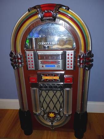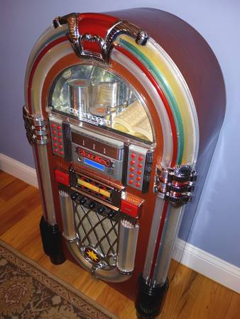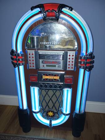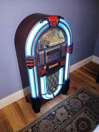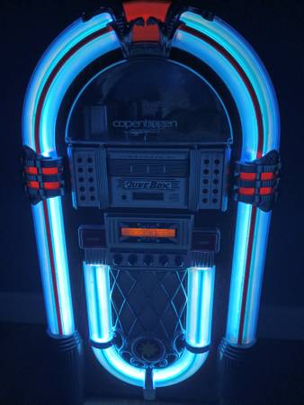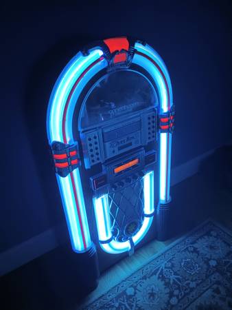 FACTORY DESCRIPTION: If there's one era we wish we could travel back in time to visit, the 1950's have got to be tops on our list. There's simply no other 1950's era icon that evokes the period like the timeless neon jukebox. It was an era that saw the birth of rock N roll and the diner. Happy Days indeed. But getting your hands on an original vintage jukebox is not only difficult, it's costly. Even reproduction jukeboxes on the market can cost well over $5000. So we decided it was time to create a jukebox that everyone could enjoy and afford. One that could play CD's and favorite FM or AM radio stations. We started by recreating the details that made the originals so timeless. An authentic jukebox wouldn't be a jukebox without brightly colored electric blue neon glowing around a curved bent wood frame. Then we went inside and added a Sony front loading 3-CD player for multi-disc play just like the old jukebox turntables. And of course we made sure to install a sound system that'll make you want to dance. 2 10W full range speakers and 2 tweeters provide full stereo sound. There's also an external speaker jack for plugging in additional speakers. Includes built-in AC adapter. It's the perfect way to bring the magic of the 50's into your home or office.