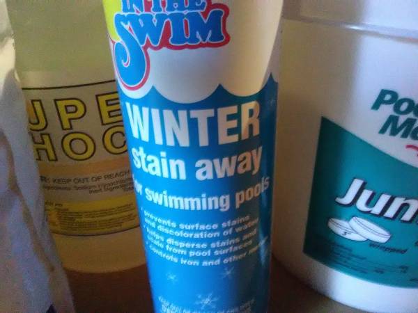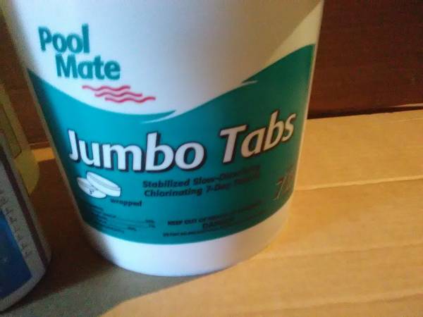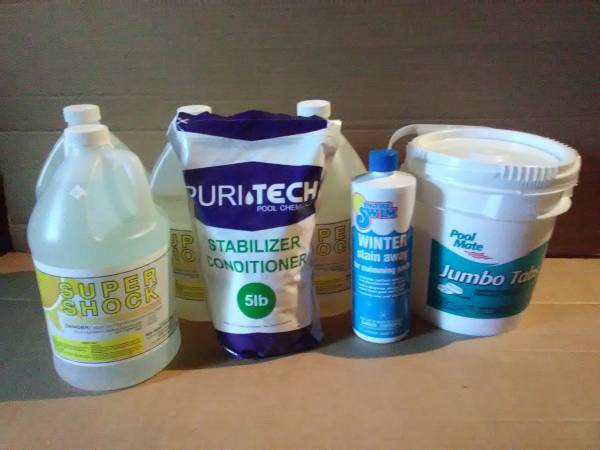 One 7 lb. bucket of Pool Mate 3" chlorine tabs, 4 Gallons (1 case) of Super Shock liquid shock treatment, one 5 lb. bag of Puritech stabilizer conditioner, and a bottle of In The Swim Winter stain away. $60 or best offer. Items are new and unused and in the original packaging. Local, in person cash transactions only. No checks or electronic transfers of any kind will be accepted, and shipping is not an option. If you are seeing this posting, this item is still available.