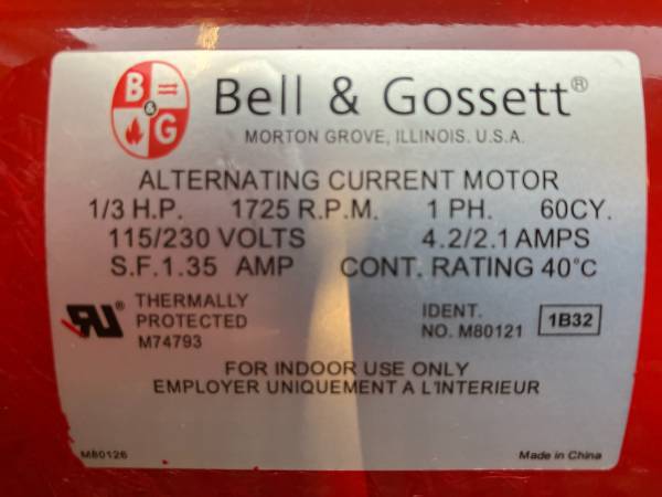 BELL AN GOSSETT PUMP MOTOR MODEL # M80121 , 1\3 HP. , 1725RPM, 115-230 VOLT. IT IS BRAND NEW. $400. PLEASE PHONE CALLS ONLY 860 677 736NINE