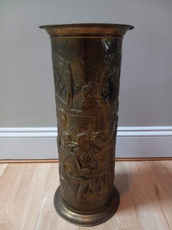 Vintage Patina Brass Embossed Umbrella Stand, multiple uses, would be lovely with dried flowers. Measures 19 inches tall x 8 inches wide. Smoke/pet free home. Cash only. Pick up in Granby, CT.