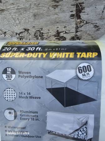 Super duty white tarp new 20' x 30' 600 square feet 16 MIL woven polyethylene 14 x 14 mesh weave Aluminum grommets every 18" Waterproof UV resistant $75 do not email...leave message
