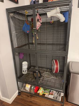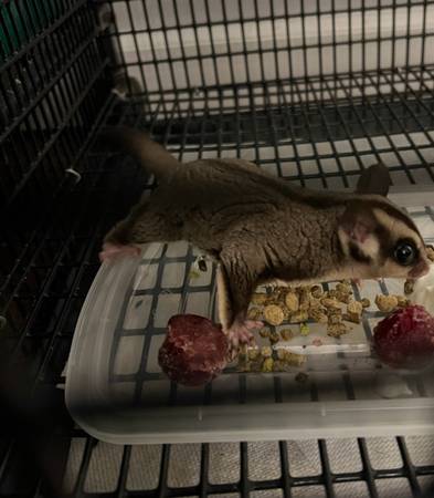 Beautiful male sugar glider, two years old. Brought him into our home as a companion for our previous sugar glider that had ended up alone after his buddy had passed away. Now this little guy, Fluffernutter, lost that buddy and is alone. I do not plan on getting any other sugar gliders, so I would love to find a home for him to join others! Sugar gliders thrive with other sugar gliders, and I don’t want him to be lonely! I do have a large cage that I could include as well. Small spots of rust, but still in good shape!