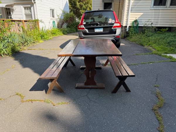 Solid wood table with collapsible sides. With the sides down, the table measures 25.5 inches x 60 inches. With the sides extended, the table measures 40 inches x 60 inches. 30 inch height. It is in great condition and just needs a little polish. One of the hinges needs to be flattened out so the extension will fit flush.