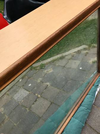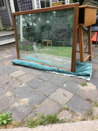 Substantial walnut framed mid century mirror. Piece is in very good vintage condition. Frame has some slight nicks and dings to the wood. Back has hanger attachments. Frame is a little scuffed but overall excellent condition.