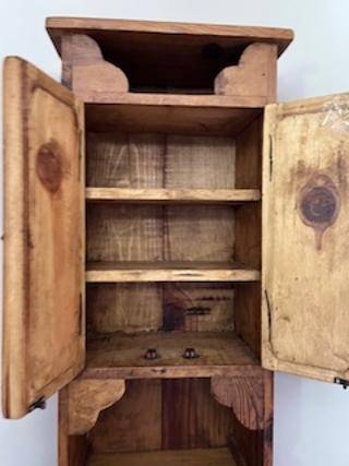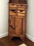 Small pine cabinet three shelves top section four small drawers middle open cabinet on bottom Two parts for easy transport 72" H x 10" D x 18"W not a corner cabinet $130.00