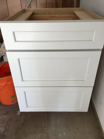 Wellborn Forest Capital Series cabinets feature all-wood maple construction. One Brand new, never installed 3 drawer Monterey style in Artic white. 24 inches Wide x 25 D x 34 1/2 H. Solid wood dovetail drawer with full-access under mount soft-close glides. Please leave name and number for any response. I have 2 similar cabinets for sale, one slightly bigger and different white color. Discount if buying both. Thanks