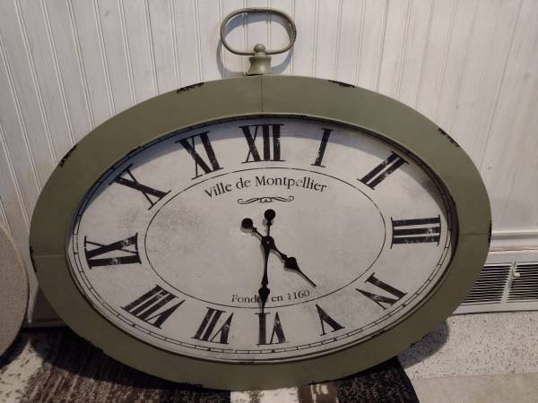 Beautiful Vintage Style Large Oval French Metal Wall Clock for indoor or outdoor use. Keeps time. Take batteries.