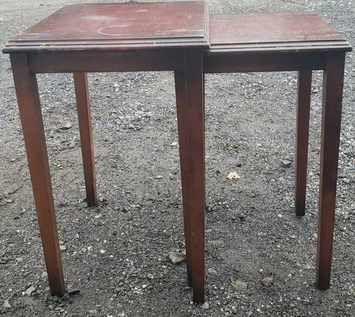 Vintage Smaller Nesting Table For Sale , they're mahogany wood in fair condition , when they are slid together they measure approximately 15 wide side to side on the larger ones top by 13" deep front to back by 20¼" high , 1 is stamped FERGUSON BROS. MFG. CO. HOBOKEN , N. J. TRADE MARK NO. 806 , they are in fair condition in need of some TCL , I'm only asking $15.00 for the pair As Is and I believe this is a fair and reasonable price......