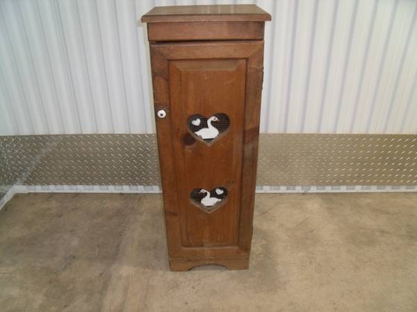 Smaller jelly cabinet aka pie safe with shelf inside. Made of solid wood. Comes with a built-in ironing board feature. Dimensions are 14"x 11" x 38". Good condition.