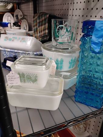 Assorted bowls/dishes/glass including: vintage Pyrex, Fire King, Anchor Hocking, Glass Bake, Fenton, Libby, Hazel Atlas, Royal China, Wheaton, carnival milk glass.