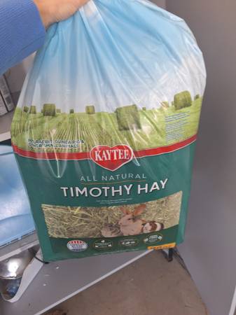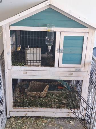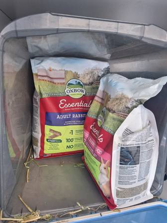 I am selling her with her house (bought second hand and I have kept her in the garage as I don't feel the cage is strong enough against predators to be put outside), a huge bag of Timothy hay even though she still prefers Alfalfa hay right now and also a bag of young rabbit food and adult rabbit food. I also have a box of pine pellets for bedding you can take. *Not selling the water bottle or food holder shown in photos.