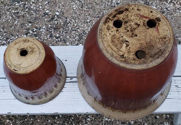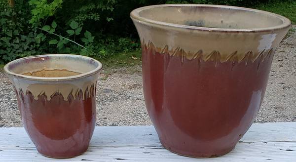 Pair of Slightly Used Heavy Brown Drip Pottery Flower Pots For Sale , the large one measures approximately 15" wide on top by 13" high , the small one is 9" wide by 9" high , they're in decent , I'm only asking $25.00 for the set AS IS and I believe this is a fair and reasonable price......
