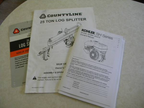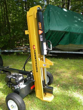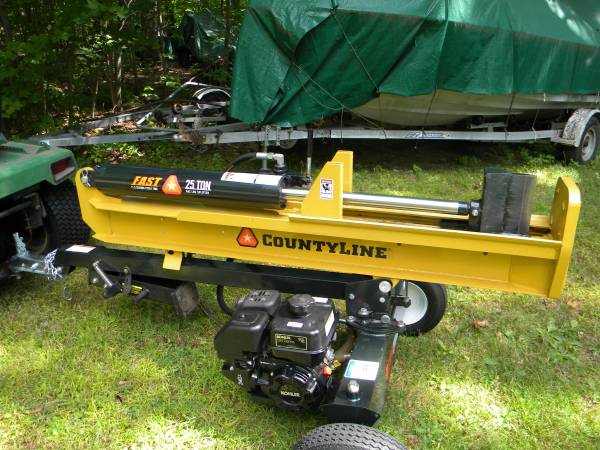 For sale is a 2-1/2-year-old Countyline 25-ton log splitter with a 6.5 HP. 196cc Kohler engine. Used only 50 hours, it remains in all but new condition. A new hydraulic oil filter has been installed and the air filter cleaned. The tires have had less than 10 miles of use. It splits up to 26" logs in vertical or horizontal positions. The Countyline and Kohler manuals are included. It takes a 2" hitch ball.