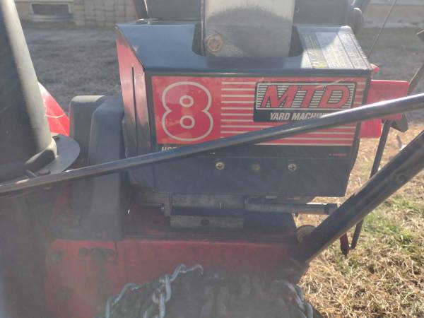 MTD snowblower, 8 horsepower, 24 width, 2 stage, electric start, tire chains, walk in enclosure, very heavy duty, runs great. 5 forward speeds and 2 reverse speeds.