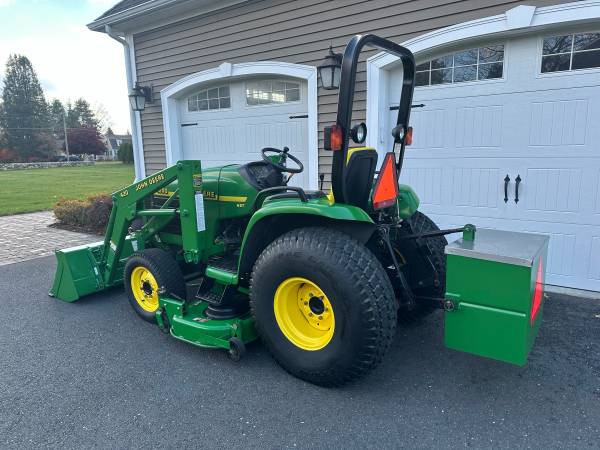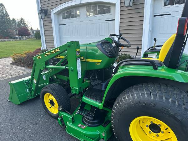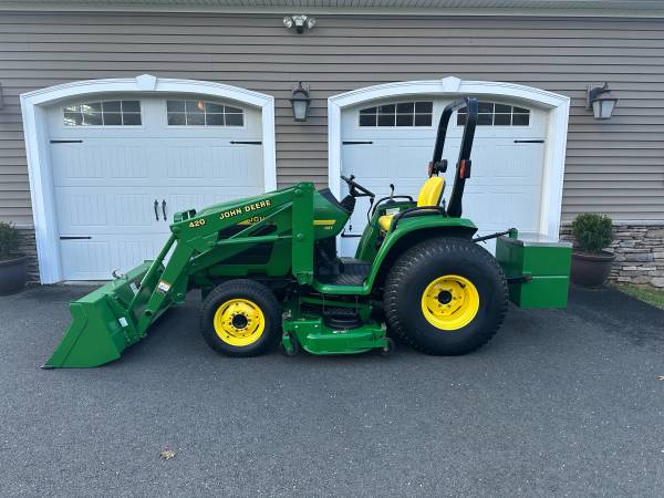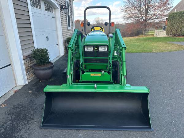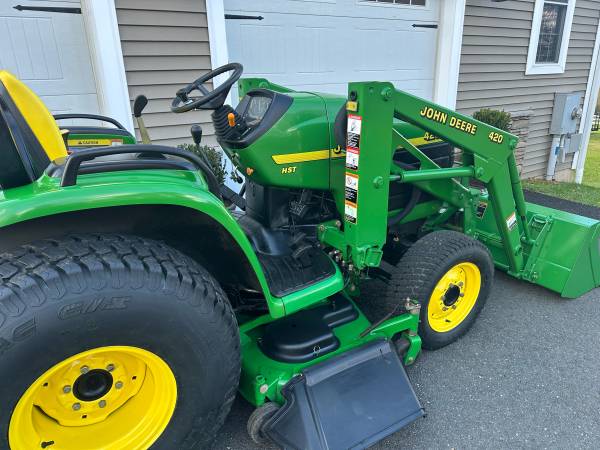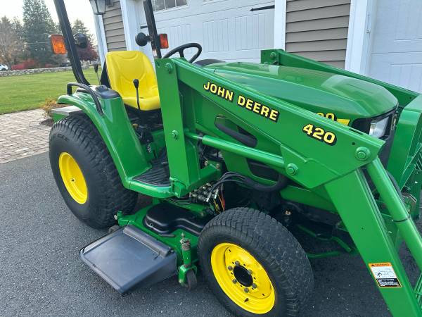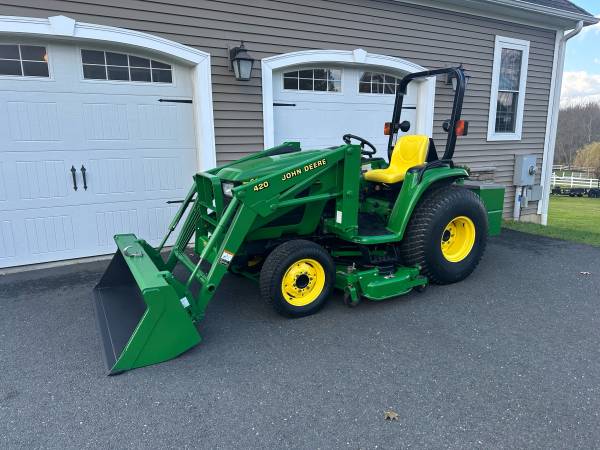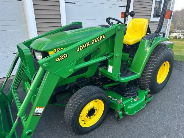 John Deere 4200 Tractor Loader Mower, 1280 hours, 3 cylinder Yanmar Diesel, 4WD, hydrostatic transmission with three ranges, power steering, cruise control, rear/mid PTO, differential lock, foldable rollover protection system, JD 420 loader with quick connect bucket, bucket hook, rear work lights, draw bar, weight box, 3 point hitch arms, JD 60 inch mowing deck with hydraulic lift, turf tires great for plowing snow, runs/operates excellent, everything works as it should, just fully serviced. Comes with all the original manuals. This is a turn key machine that is extremely easy to operate, service (pre-emissions), and transport (5000lbs). Asking 18900 or best reasonable offer. Cash only. Local delivery available. Serious buyers only please. Year is early 2000s. Tractor trades considered.