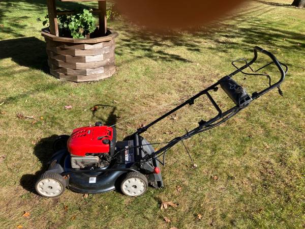 Deluxe self propelled 21" Troy-Bilt lawn mower, with key actuated electric start. Powerful Briggs and Stratton engine. Single lever height adjustment, handle folds for storage. Recently serviced, tuned up, oil changed, blade sharpened. Clean, looks and runs like new. Ready for trouble free mowing and leaf mulching. $175.