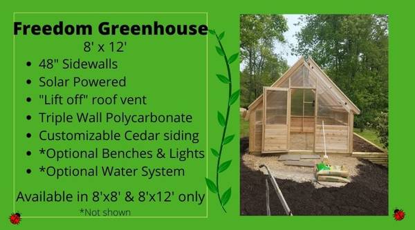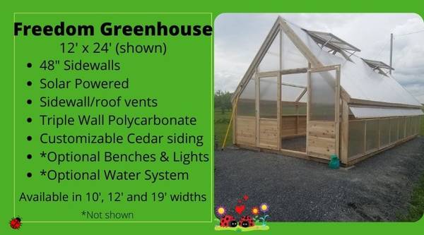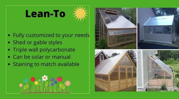 Our greenhouses are built with reliability and function in mind along with being able to provide a hands off experience with solar powered vents and watering. We also offer a simpler non solar greenhouse with wax style danish openers for the budget conscience shopper along with a brand new hybrid model, the Gro-Mor, which incorporates some of the best features from all models. Each greenhouse is custom built to order. Pictures are some examples of the work we have done. Message or call 207 613 2974 for more details or to place your order.