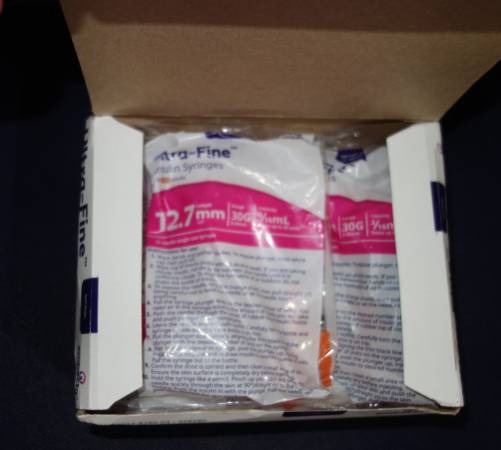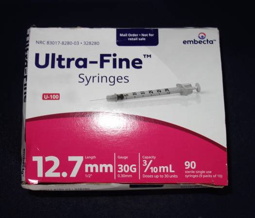 My dog that recently died was a diabetic. I used this type of syringe for her insulin. I just recieved this box of syringes. They are for 30 units or less. 30 gauge 1/2" (12.7mm). The box contains 90 Sterile single use syringes (9 sealed packs). I am asking what I paid for them which was $40.00. If interested please message me.