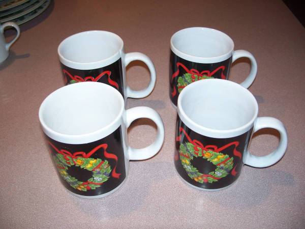 4 Matching Cups with a Wreath Design: $8 for all Four. One does have a very small chip on the edge but not in an area that you would sip from. So, throwing that one in for free. Or $3 each if bought separately.