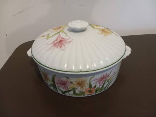 Vintage Porcelain Covered Casserole Dish, Jade Lily by Shafford. Beautiful floral colors. New, never used. Smoke/pet free home. Cash only. Pick up in Granby, CT.