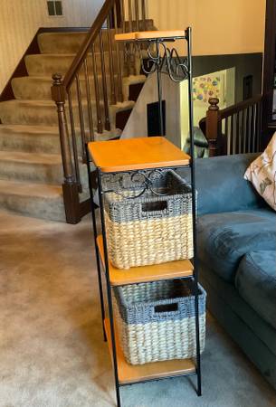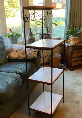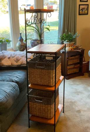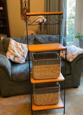 Bakers rack / utility rack with baskets and wooden shelves. This rack can be used in many different ways in your home. It is not a light weight, it’s fairly heavy and will stand along—LIKE NEW CONDITION. It measures 54in. high, 17in. wide, 13in. deep original cost $200.00