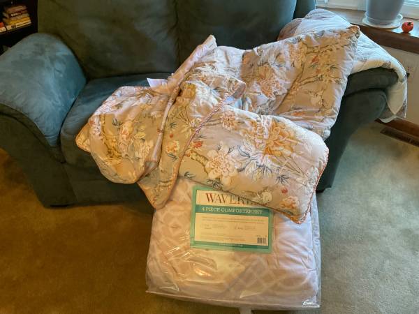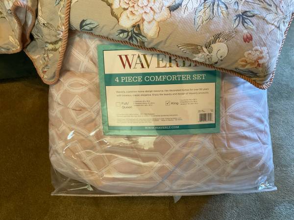 New, never used king size comforter set comes in its own container.. Includes 2 king size shams, 1 king size bed skirt, 1 king size comforter. $40.00