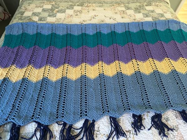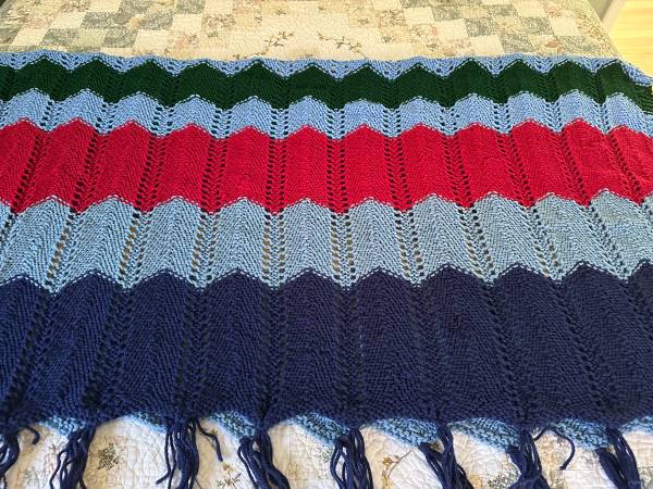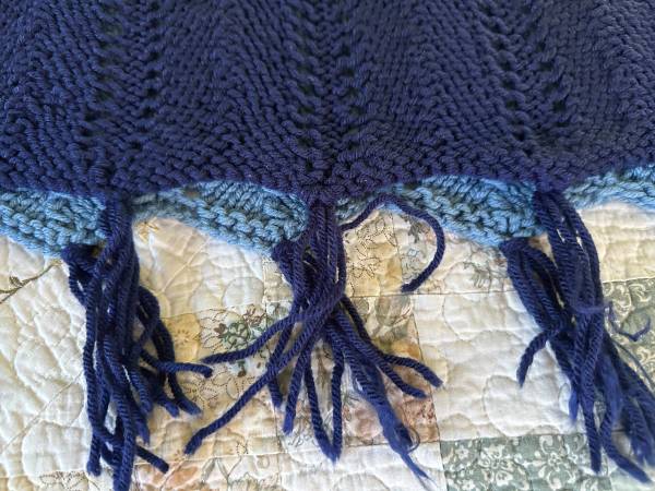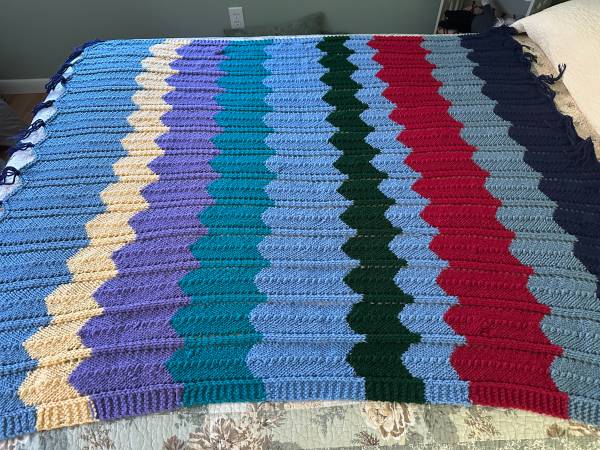Multi-Colored Hand-Knit Afghan/Throw with Dark Blue Fringe -...