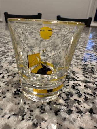 - Yellow/Black with Sun, 1 oz, 2.25" Tall (chip on rim)