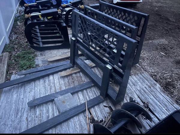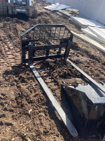 Heavy duty adjustable fork attachment for skid steer. These are new never used. Heavy duty cage. 48” Class 2 forks made in USA Brand New Also have 5 foot fork for $1200 Also have lighter duty 5 foot...