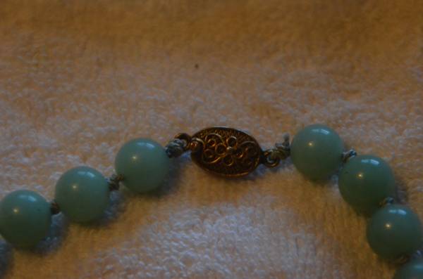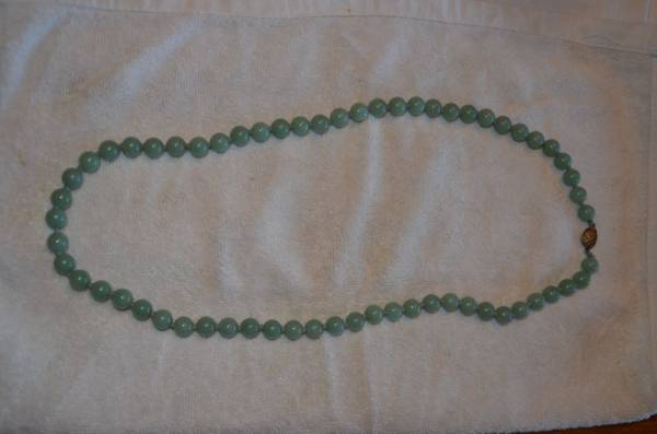 This Vintage Chinese Green Export Jade Beaded Necklace with a Silver Vermeil Clasp is a stunning piece of jewelry that showcases the beauty of green jade stones. The necklace features a classic beaded style with round jade stones, measuring 24 inches in length. Made in China during the Retro era of 1935-1950, this handmade piece is a unique and original addition to any jewelry collection. The signed silver clasp adds a touch of elegance to this vintage gemstone necklace, making it a timeless accessory for women who appreciate Chinese craftsmanship and unique design.