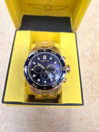 Invicta 0073 Blue Faced Gold Toned Chronograph Watch in Box Like new! Still in plastic! Any questions? Feel free to call/chat/email.