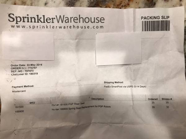 I have 33 Hunter PGP Riser Seals and 33 Hunter PGP Spring Seal replacements. The packing slip says 35 but I used 2 of each. Here is info on them. Hunter 181500 PGP Riser Seal Part # Hunter 269400...