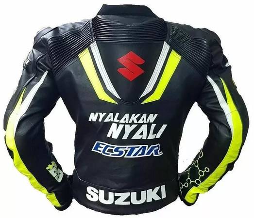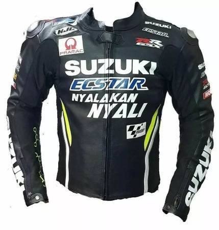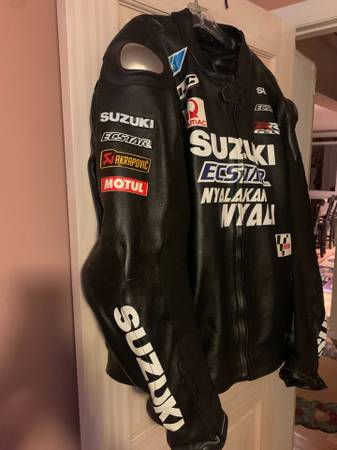 I have a Suzuki Motorcycle Jacket in 4-5XL. It will fit a 175 - 225 lb. person very well. I'm 255 and it fits but it is too tight. I used it in the early spring for visibility on my Vstrom. It does say GSX-R on it but that didn't bother me. Very nice jacket with nice weight leather. Hardly used with a few scuffs from setting it down. Fully armored. Online for 230-260 in this size. Call or text show contact info