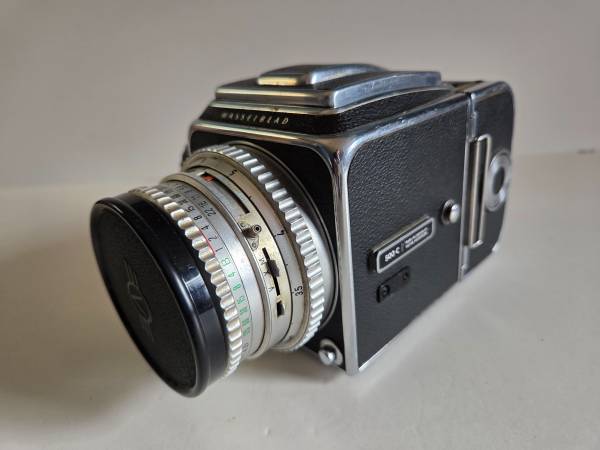 Hasselblad 500C with 80mm lens, 2 A12 film backs, eyelevel finder,lens shade and camera strap. All in good used condition.
