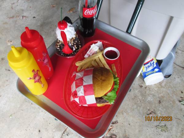Nice Vintage aluminum Car hop Window Tray. Complete with display food . Perfect for car show display or your favorite car cruise. Everybody loves it. A must have for your favorite car guy / gal....