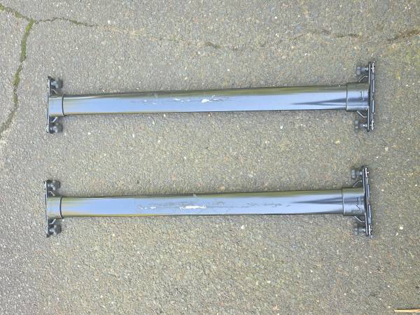 Used OEM black crossbars that fit a 2010-2015 Lexus RX350 or RX450H OEM roof rack rails. These crossbars have little to no rust since the car was garaged and are in good condition. The tops of the bars have some black paint scratched off through use.
