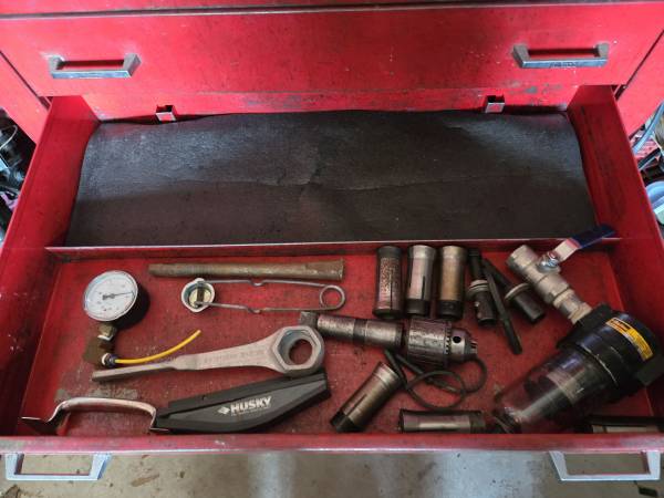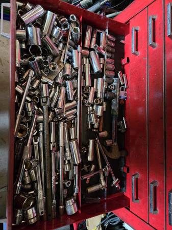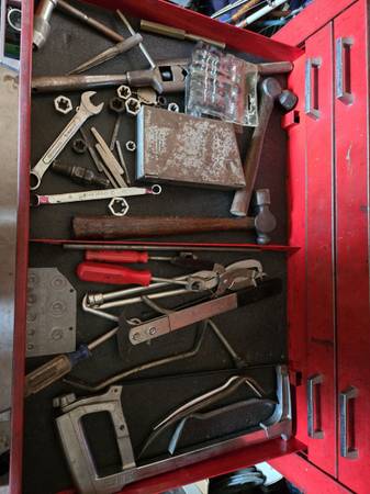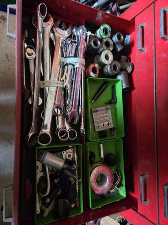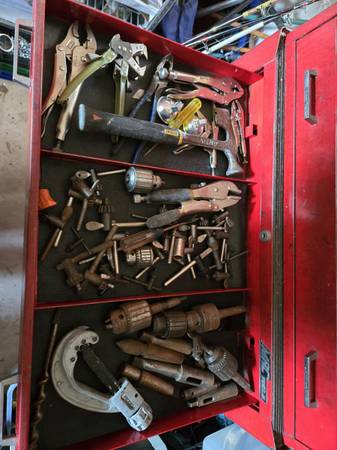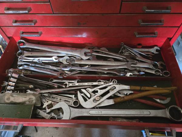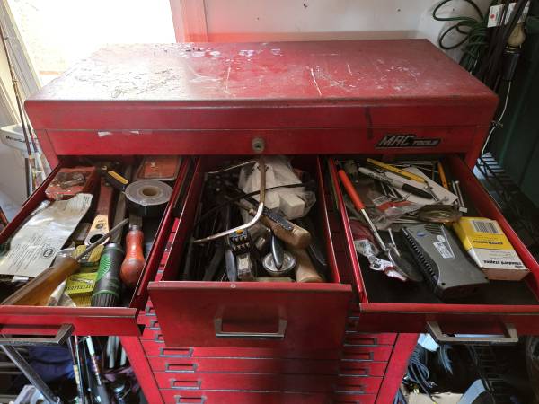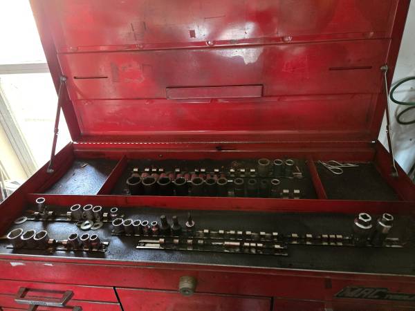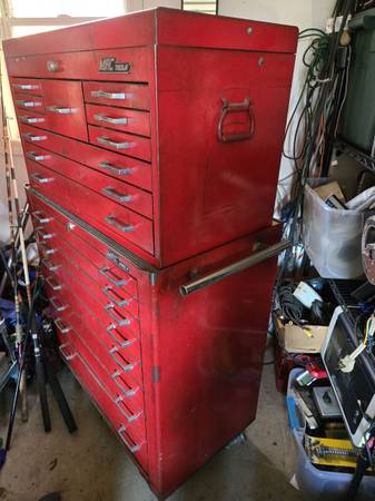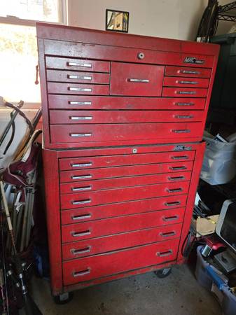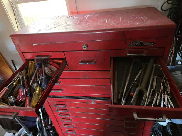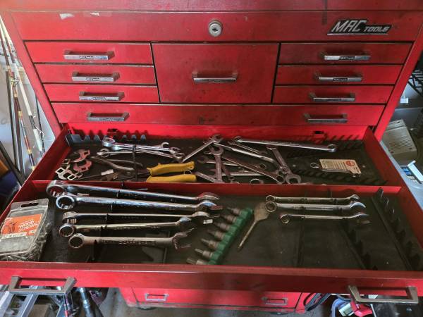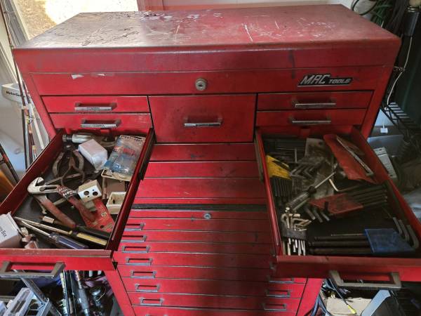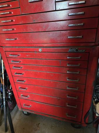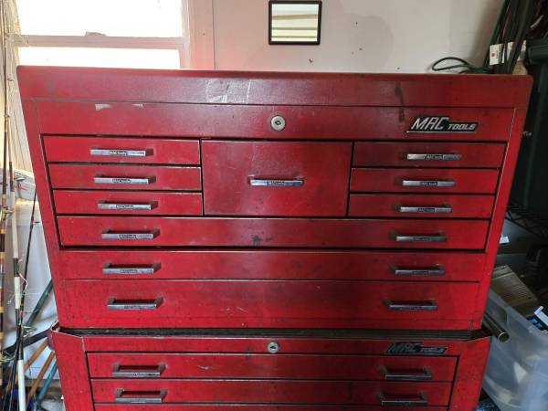 Vintage mac tools toolbox. All drawers have tools in them with most of them full. All drawers are very smooth. The model of the top cabinet is m910 and the bottom cabinet is mb920.Tons of wrenches, ratchets, sockets, hand tools, etc...Variety of brands. Looking for a quick sale so feel free to make offers. Measures 58" tall 33.5" wide by 18.5" deep Located in Norwich.
