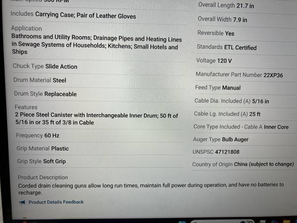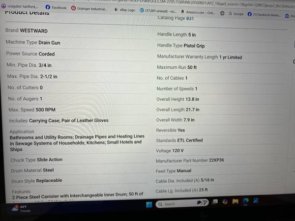 WESTWARD DRAIN CLEANING GUN MODEL# 22XP36 SEE PICTURES FOR MORE INFO. $225. CALL 860 677 736NINE