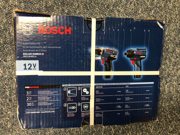 Selling a Bosch 12V cordless Power Drill and Impact Driver combo kit. Brand new in original factory sealed box. Model GXL12V-220B22. Never been opened or used. Brushless motor. Electronic motor protection. Metal gear. LED light. Power drill has 3/8 inch chuck and produces 300 in-lb of max torque. The Impact Driver has 1/4 inch chuck and produces 975 in-lb of max torque. Comes with 2 batteries, fast charger, belt clip, and carry bag. Price is $120 cash. Serious inquiries only please. Ad will be removed when it is sold.