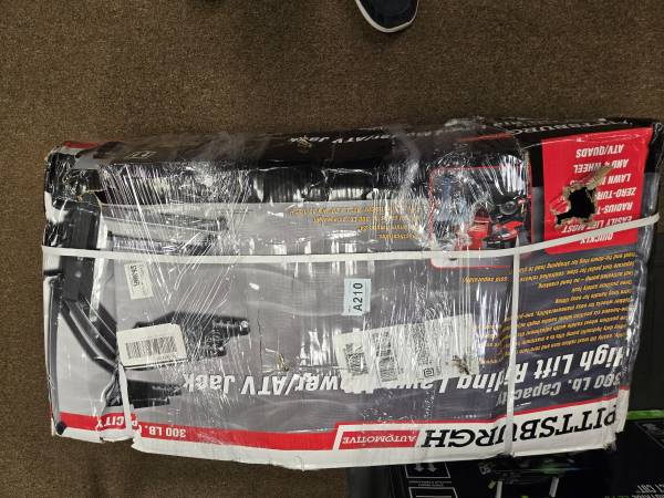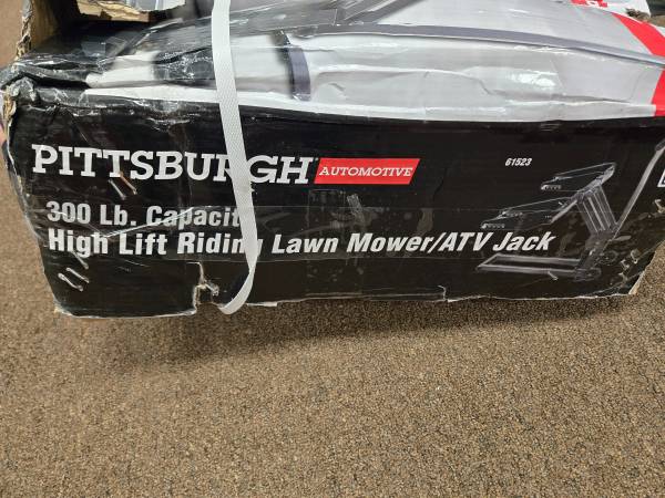 Pittsburgh 300LB High Lift Lawn Mower/ATV Jack New in damaged box. Item is never used, box has been ripped and bent. Any questions? Feel free to call/chat/email.