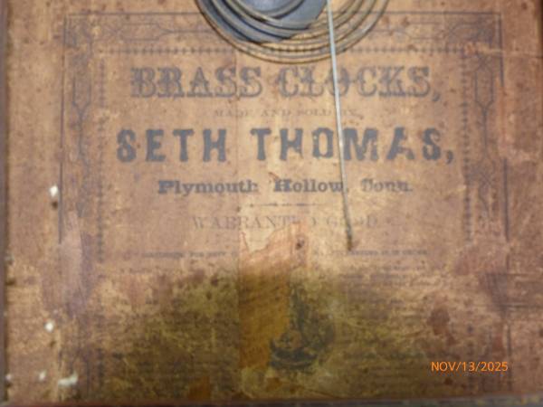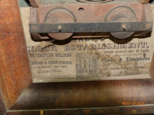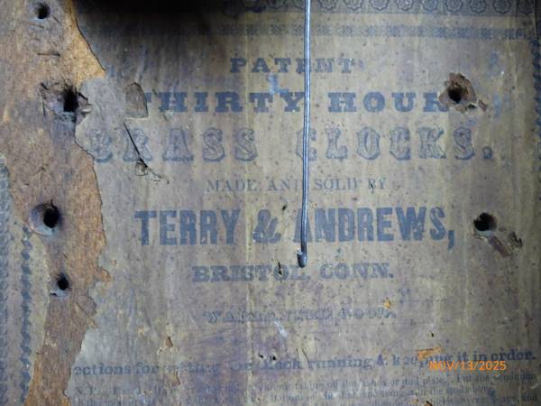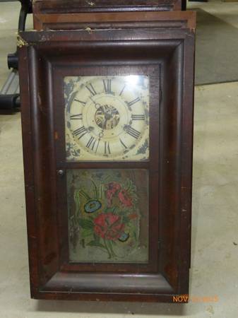 Four antique ogee clocks, mostly original, in need of cleaning and some restoration. All with labels (Seth Thomas, Brewster and Ingraham, Terry & Andrews, and J. J. Beals). The Beals has a fusee...